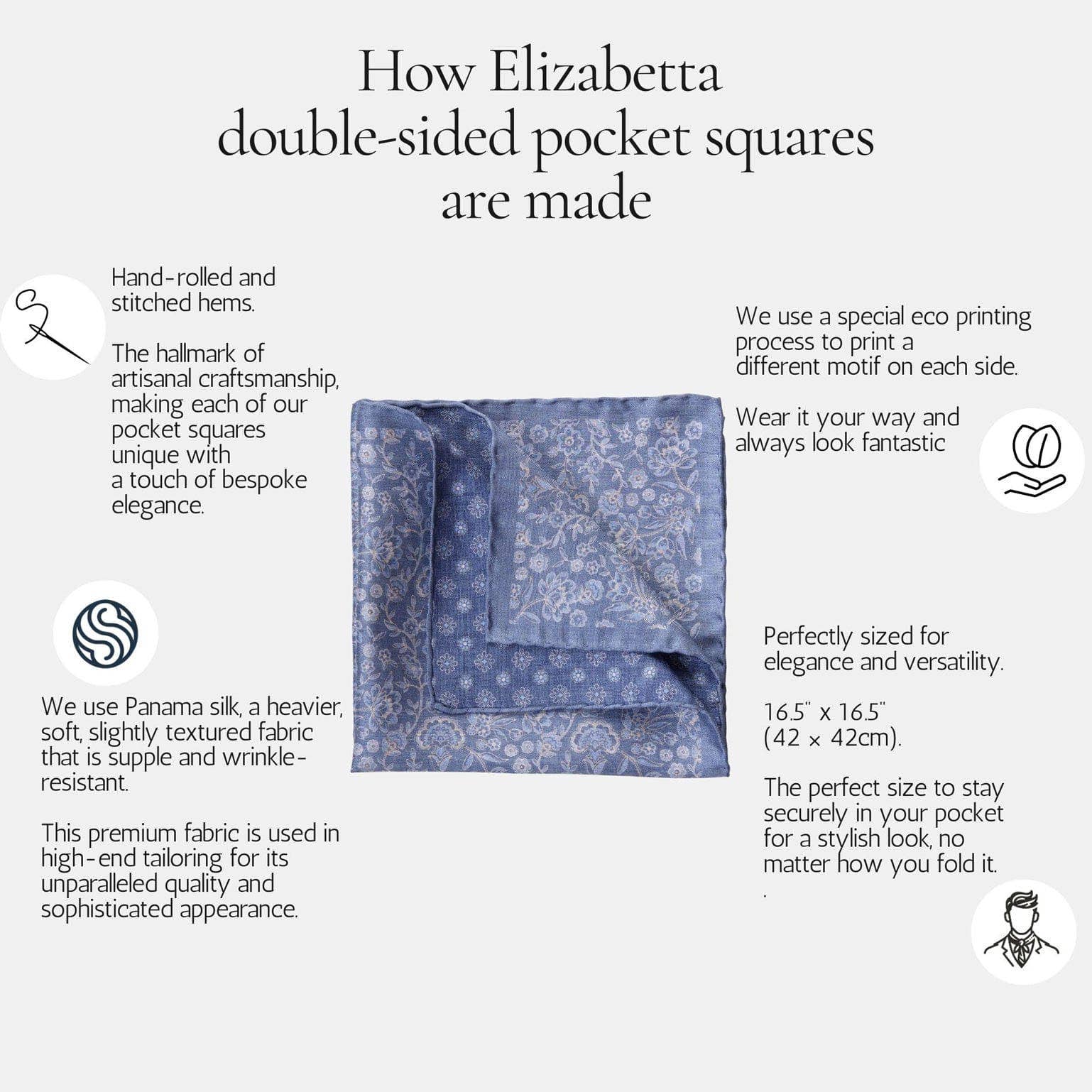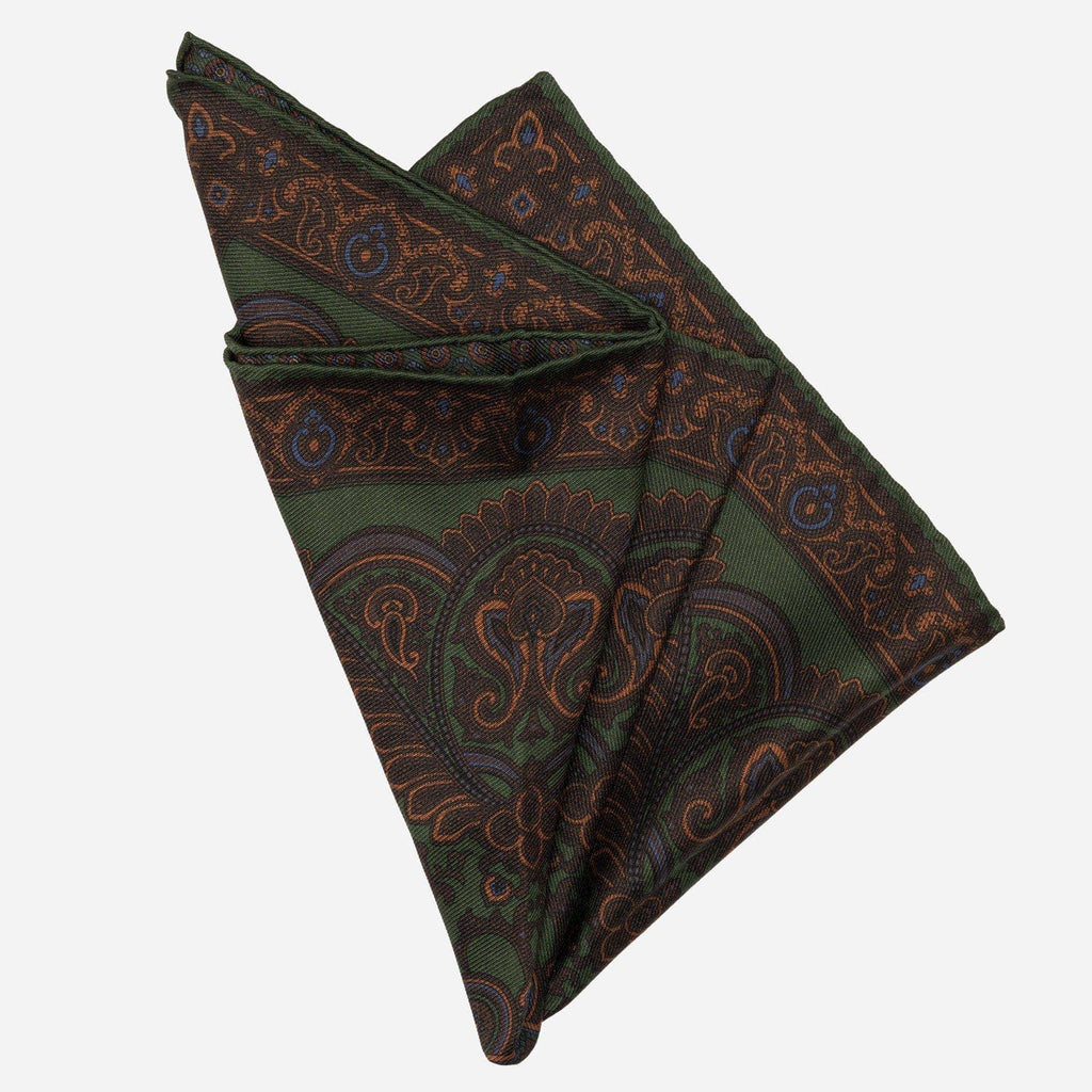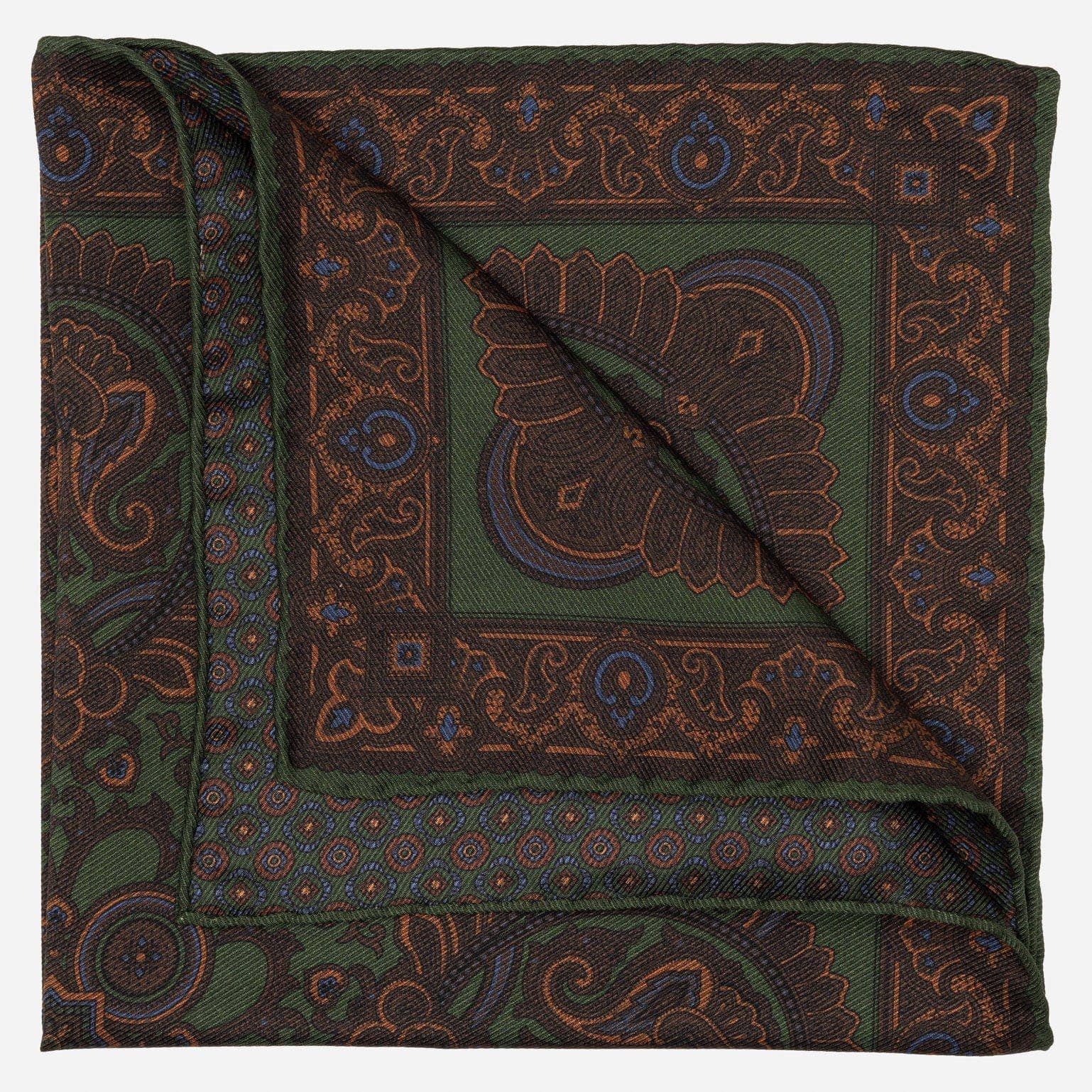 One pocket square. Two sides. A classic paisley on one side and traditional medallions on the other. Change it up depending on the day, or the jacket. Made from true Madder silk with that smooth, matte finish you only get from the old-school dyeing process. Details * Large size: Approx. 17.5" x 17.5" (45 x 45cm). This is the correct size to allow for many folding styles and it will not slide down into your pocket. * 100% Madder Schappe Silk Saglione: Experience the luxurious buttery feel of Schappe silk, also known as ethical silk, crafted from cocoons that the silk moth broke naturally. Our heavy-weight 32-momme silk is first dyed, then printed, and finished with madder, making it a truly exquisite choice. * Hand-rolled hems: For the ultimate in luxury and sophistication, our hems are hand-sewn. * Limited edition: We make these in small quantities, so you know your pocket square is truly one-of-a-kind. * Pure luxury, naturally dyed: We use non-toxic vegetable dyes that preserve the silk's